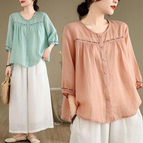 [옷자락]여성 하트 자수 라운드넥 반팔 티셔츠 남방 블라우스
