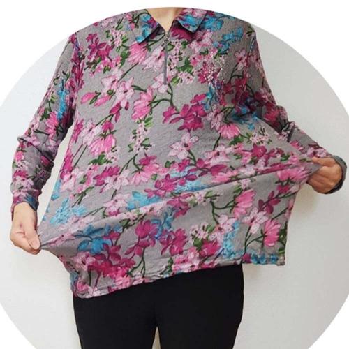 [셀럽하우스]꽃 VIDF2180 기모 지퍼 카라티 할머니 평상복 플라워 포인트티