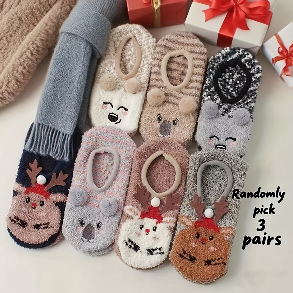 TEMU 여성용 겨울 따뜻한 크리스마스 사슴 슬리퍼 3켤레 - 사슴 & 눈꽃 디자인의 두꺼운 바닥 양말, 부드러운 플러시 & 미끄럼 방지 고무 밑창, 손세탁/드라이 클리닝, 가정, 요가, 크리스마스 장식 (빨강, 녹색, 갈색, 분홍색, 보라색, 주황색)