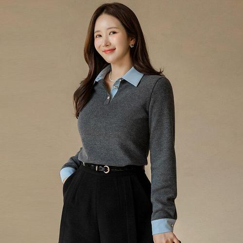 [스타일온미][루이스엔젤] 제레미 카라 배색 진주 리본 버튼 셔츠 니트 블라우스