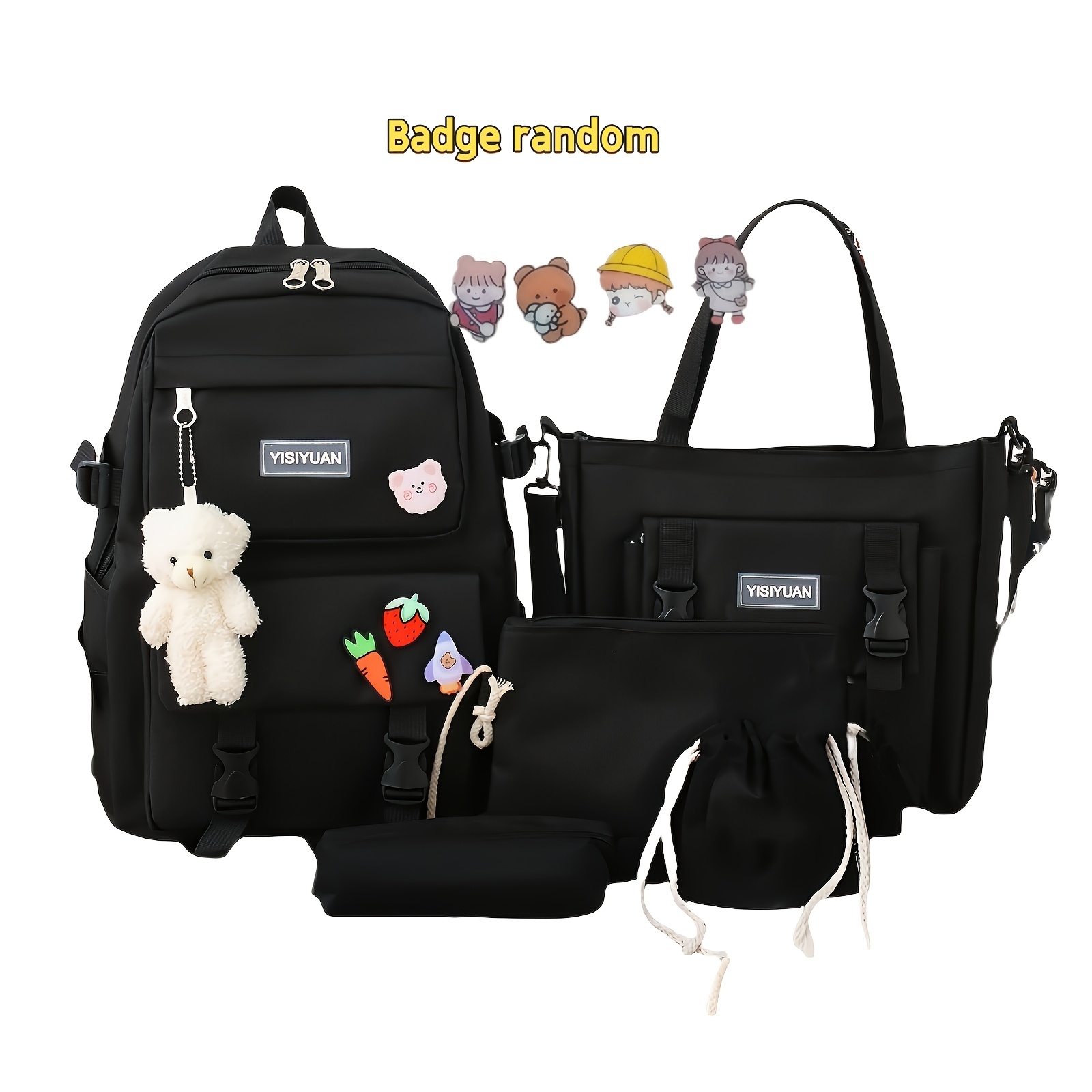 TEMU 새로운 패셔너블한 심플 컬러블록 다기능 메이크업 가방, 경량 대용량 학교 백팩 5개 세트, 랜덤 곰돌이 펜던트 배지가 있는 아웃도어 여행용 백팩