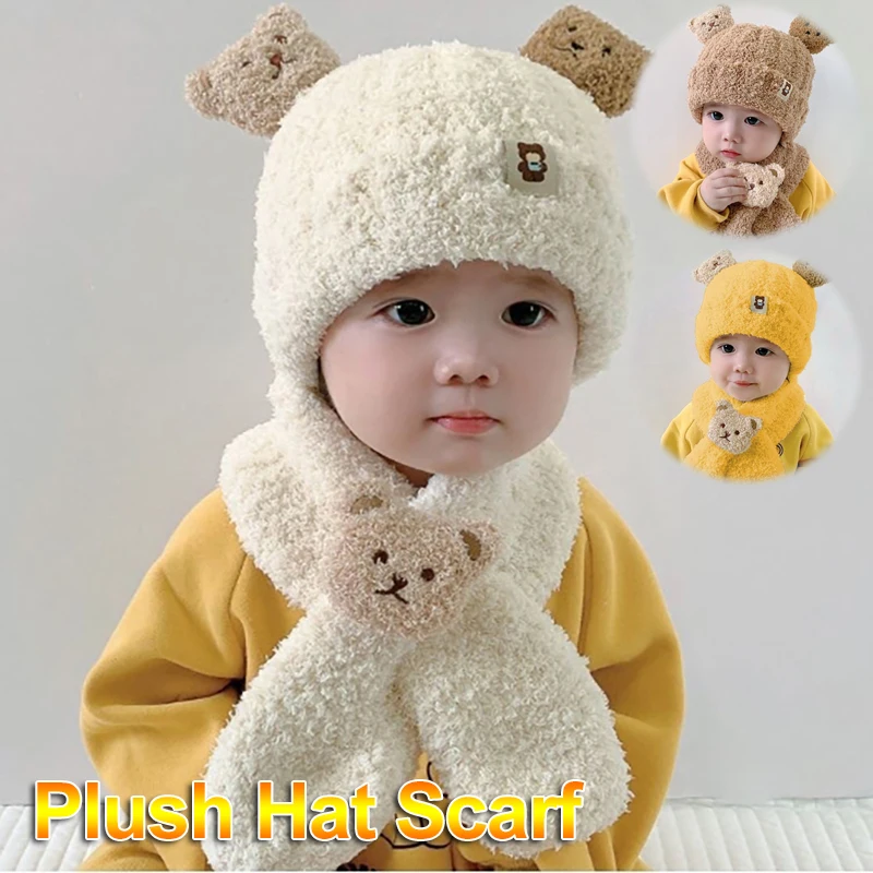 따뜻한 아기 모자와 스카프 세트 귀여운 곰 소년과 소녀를위한 두꺼운 겨울 모자 Windproof 양털 신생아 사진 액세서리