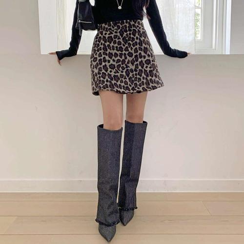 여성 호피 에이라인 앙고라 슬림핏 스커트
