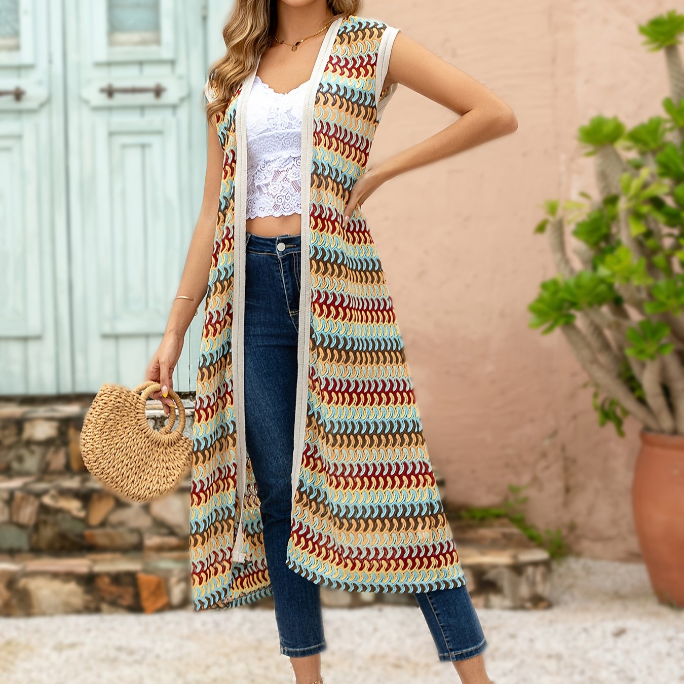 TEMU 여성용 경량 통기성 가디건 - V넥 긴소매 비치 재킷, 루즈핏 올 시즌 레이어링, 캐주얼 & 포멀 의상, 다용도 의류, 기하학적 패턴, 스타일리시 아우터, 패션 애호가