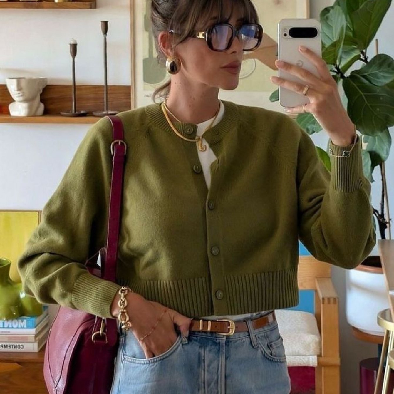 TEMU 프렌치 스타일 우아한 그린 오픈프론트 버튼 크롭 루즈핏 가디건, 봄 가을 캐주얼 출퇴근 및 파티용, 성 패트릭의 날 가디건 NS702