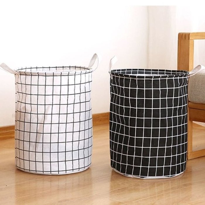 엄지척 접이식 화이트체크 빨래바구니-원형 다용도 수납정리