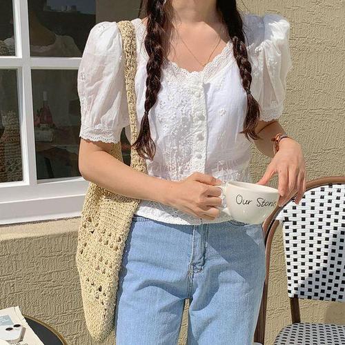 [신상오픈런]여자 화이트 레이스 자수 브이넥 반팔 블라우스