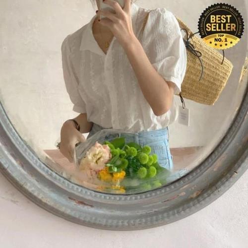 [라일리의류] Rly 퍼프소매 플라워자수 레이스 화이트 블라우스 브이넥