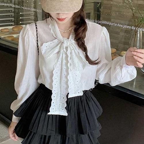 [오노마] ONM 넥 물결 레이스자수 화이트타이 긴팔 블라우스 시스루