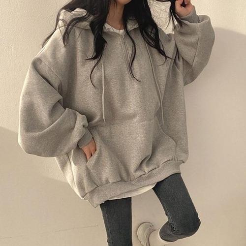 [엄지척]여성 데일리 캐주얼 스타일 반집업 회색 무지 후드티_19593850_667501