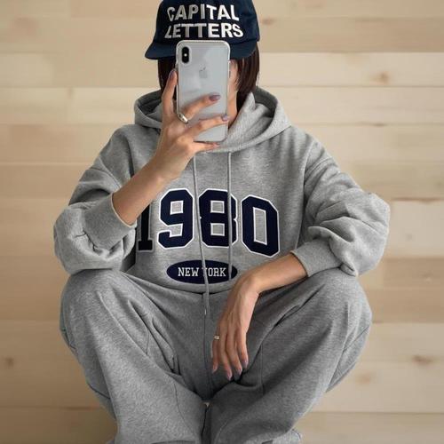 [미라클세븐]여성용 겨울 후드 티셔츠 회색 포켓 자수 캠퍼스 스타일