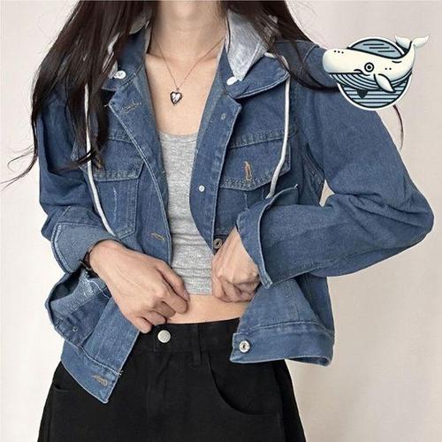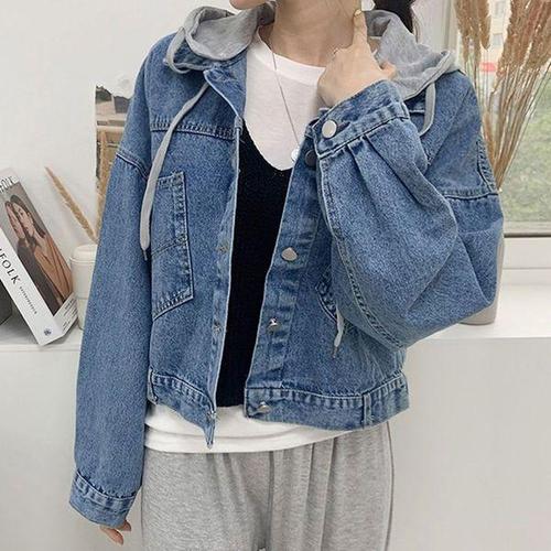 [에이치플러스몰]탈부착 배색 후드 데님 자켓 크롭 길이 데일리 재킷