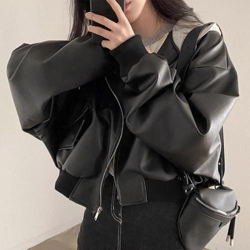 여성 루즈핏 페이트 레더 항공 점퍼 가죽 후드 자켓 WFKZ8RY
