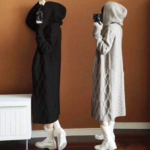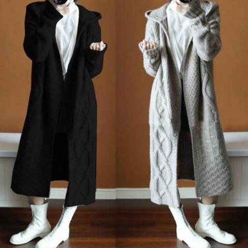 [에이치플러스몰]여성 간절기 초겨울 후드 롱가디건 꽈배기 니트 루즈핏 아우터 2색