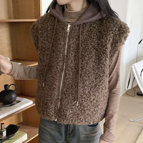 [옷자락]여성 캐주얼 뽀글이 퍼 스트링 후드 집업 베스트