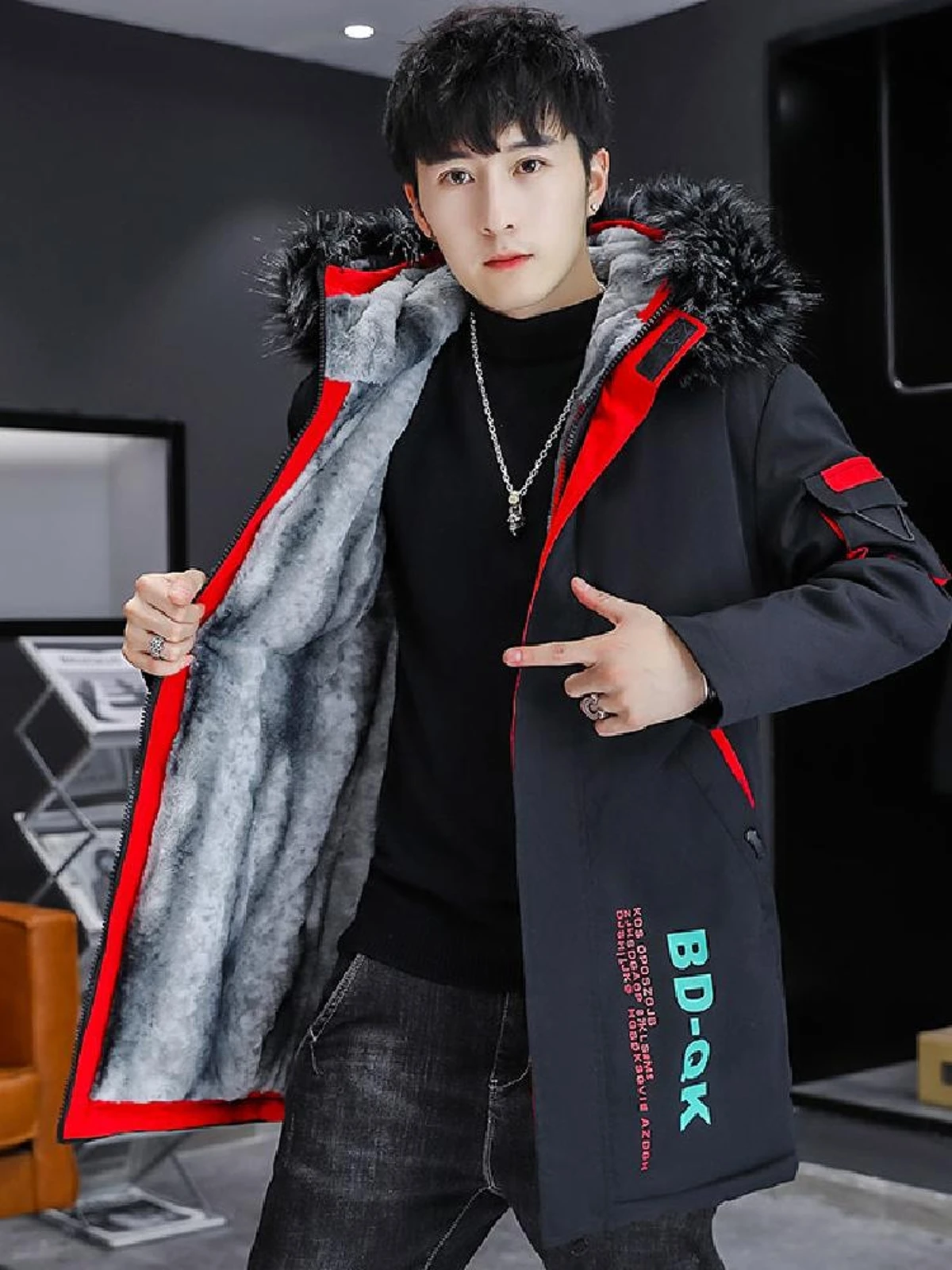 남성용 겨울 코튼 재킷 중간 길이 플리스 안감 두꺼운 후드 코트 캐주얼 트렌디 오버코트 젊은 스타일 폴리에스터 섬유