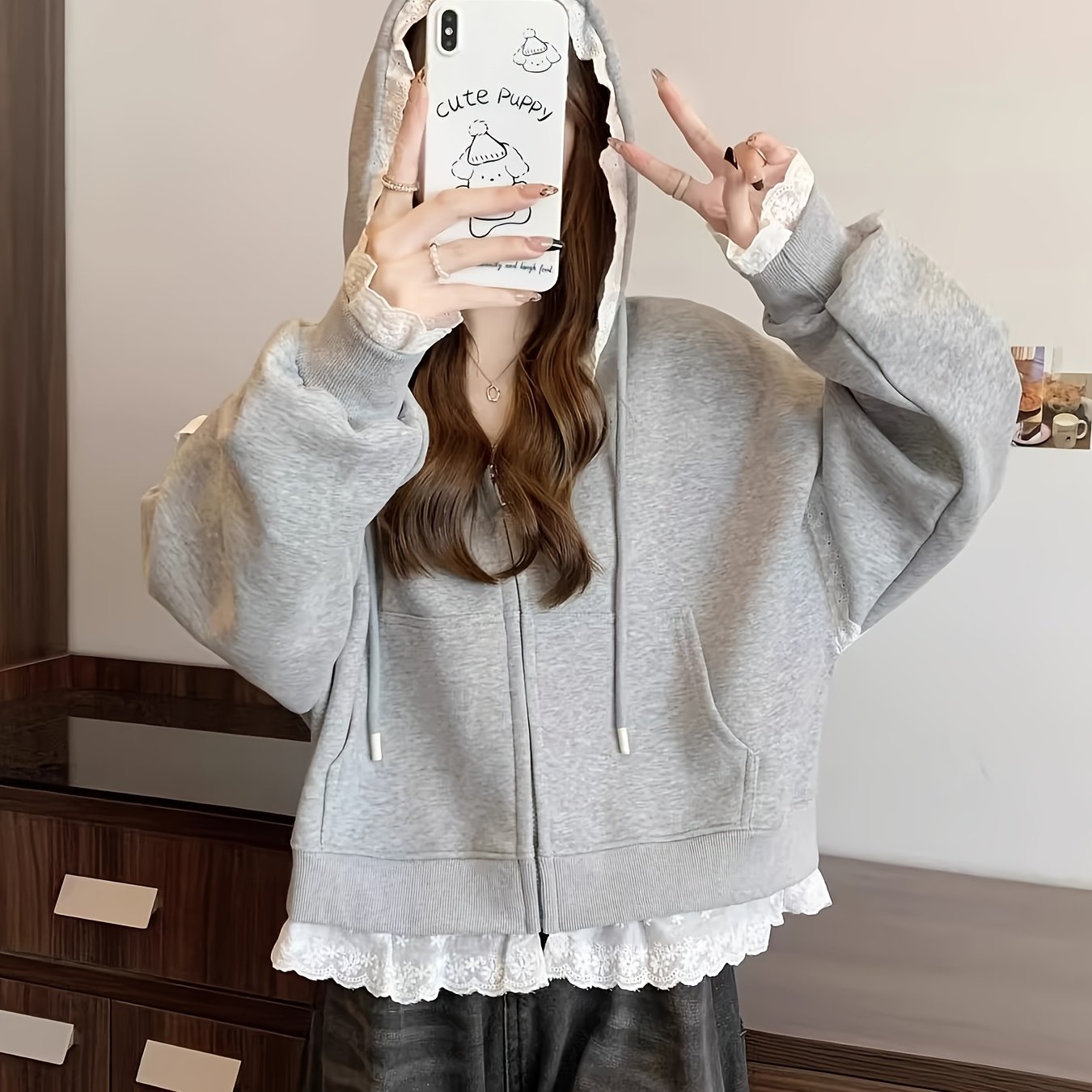 TEMU 여성용 귀여운 오버사이즈 후드 자켓 - 풀 지퍼 프론트 & 대칭 밑단, 그레이 봄/가을 코트, 레이스 느낌 칼라 & 후드, 캐주얼 또는 드레시한 룩에 어울리는 루즈 (세탁기 사용 가능) - 한국 스타일 아우터웨어