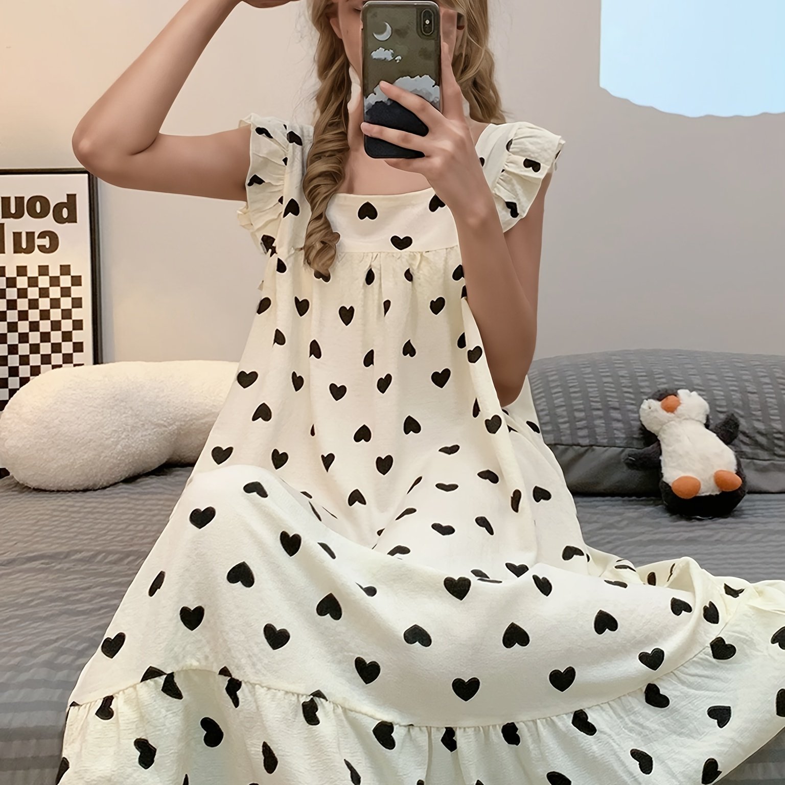 TEMU 여성용 여름 민소매 스퀘어넥 나이트가운 - 블랙 & 화이트 하트 프린트 플레어드 헴 슬립셔츠 드레스, 통기성 가벼운 라운지웨어, 편안한 잠옷, 캐주얼 루즈웨어, 부드러운 소재, 플레이풀 하트 패턴, 코지 나이트웨어