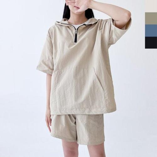 후드 반바지 트레이닝복 여자용 아노락 반팔 세트