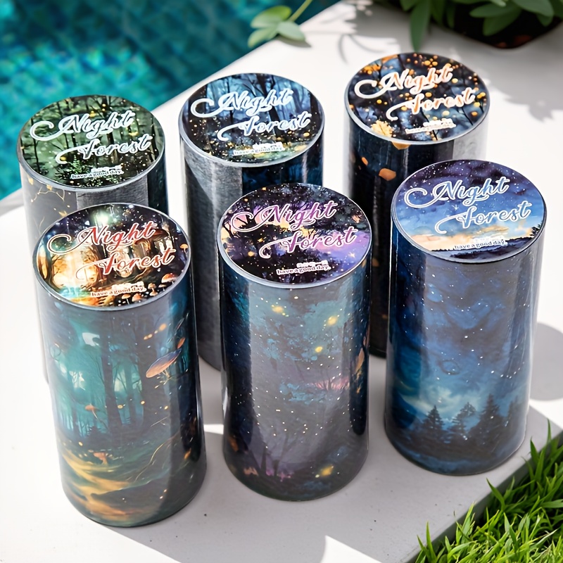 TEMU 6롤/팩 와시 테이프 - 8cm×200cm, 마법의 별이 빛나는 숲 패턴, 생생한 색상과 내구성 있는 접착력. 저널, 플래너, 물병, DIY 공예, 마법의 숲 장식, 자연스러운 스타일 장식, 스크랩북 용품, 플래너 장식, 고품질 종이, 매끄러운 질감, 문구류 액세서리, 장식 스티커, 저널 애호가, 공예 애호가에게 적합
