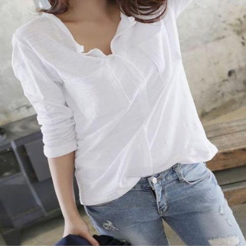 [에이치플러스몰]루즈핏 긴소매 V넥 캐주얼 봄 가을 데일리 티셔츠 흰셔츠 와이셔츠 여성셔츠