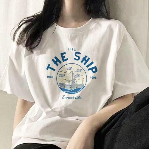 여름 루즈핏 여성 프린팅 순 티셔츠 반팔 티 흰 면 WFLONY2