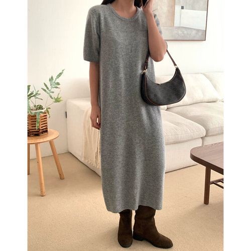 에르디테 / 여성 라운드넥 루즈 오버 핏 5부 반팔 울 비스코스 니트 롱 원피스 3컬러