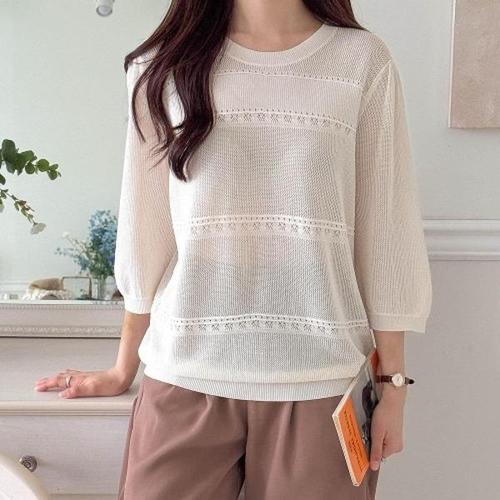 [다잇템][다잇템] 여자 크로쉐 칠부 여름반팔니트 벌룬 라운드 티셔츠_21056295_588872
