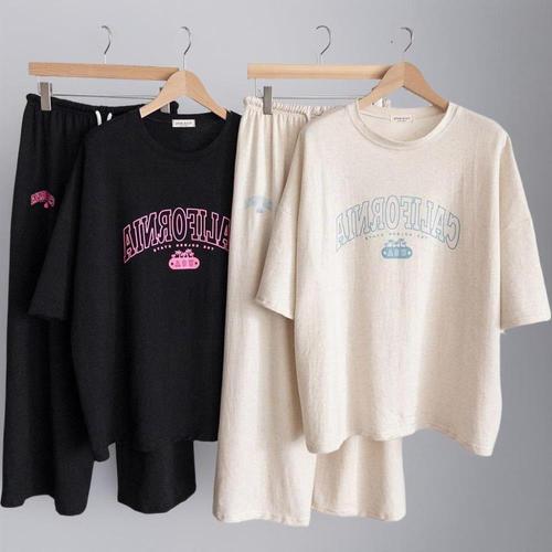 [옷자락]여자 박시 프린팅 칠부 반팔티 와이드핏 밴딩바지 세트