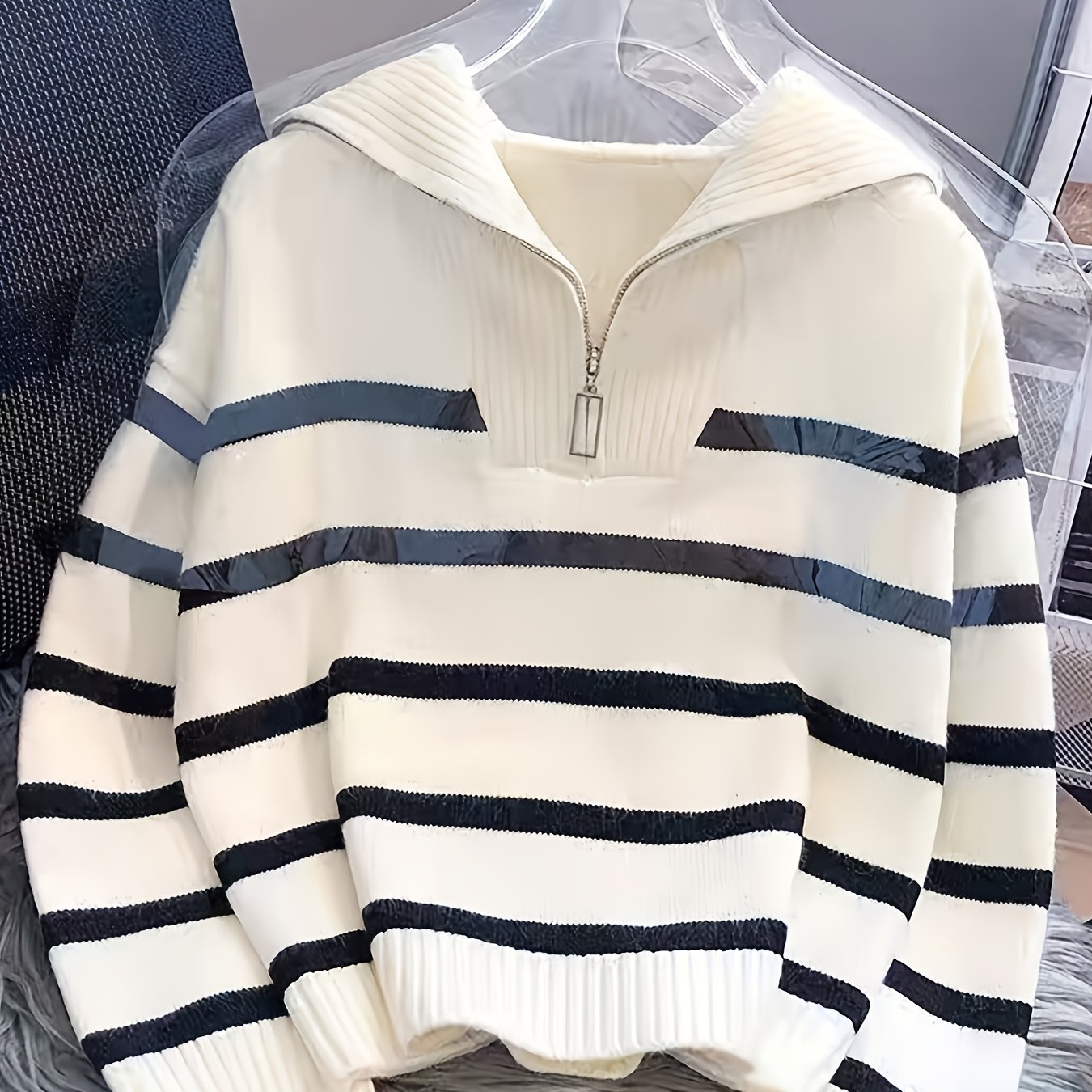 TEMU 여성용 스웨터 - 베이지 & 네이비 블루 가로 줄무늬, 하이넥 풀오버, 루즈핏 긴팔 가을/겨울 캐주얼 & 포멀웨어, 계절별 레이어링, 우아한 니트웨어, 고품질 스티칭, 세련된 탑, 캐주얼 웨어