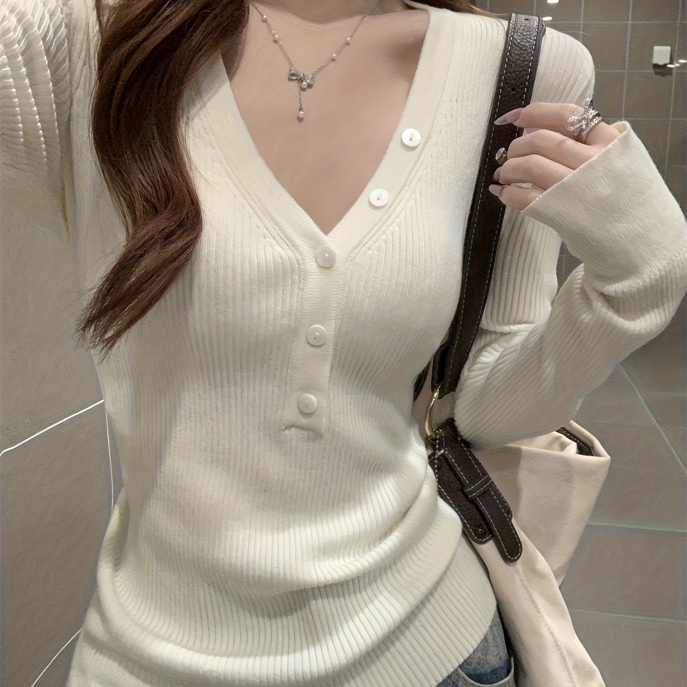 TEMU 여성용 우아한 V넥 긴팔 스웨터 - 부드럽고 신축성 있는 버튼 앞면 탑, 시크한 오피스 & 데일리 스웨터 (가을/겨울), 오피스, 파티, 캐주얼 의상 - 여성 의류 필수품, 스웨터, 파티 복장, V넥 디자인, 고탄성 원단, 시크한 오피스 & 데일리 스웨터