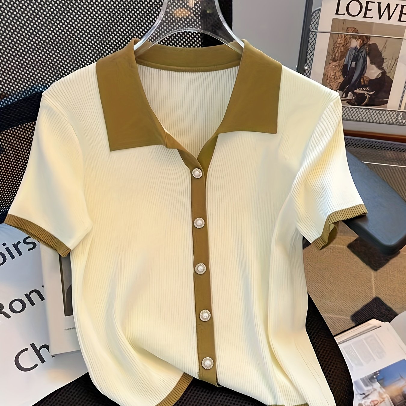TEMU 여성용 프랑스 감성 폴로 칼라 니트 상의 - 반팔, 가벼움, 버튼 디테일이 있는 컬러 블록 디자인, 봄/여름 캐주얼 착용에 완벽, 봄 패션 상의 | 세련된 폴로 스타일 | 리브드 텍스처