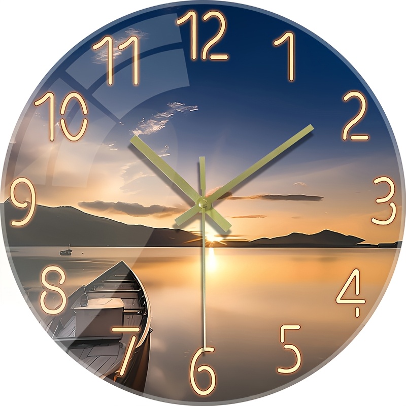 TEMU 일몰 산과 호수 장면이 있는 12인치 무소음 유리 벽시계 & 보트 디자인 - 두꺼운 강화유리, AA 배터리 작동(포함되지 않음), 거실용 모던 라운드 시계, 침실 장식 - 완벽한 휴가 및 생일 선물, 거실 벽시계