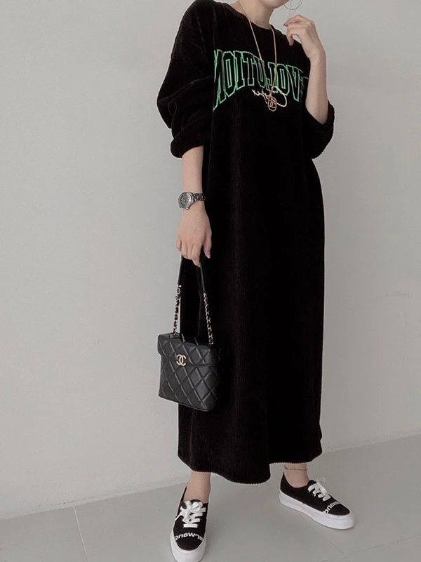 플러스 사이즈 여성 벨벳 프린트 스웨트셔츠 드레스 패셔너블 루즈 한국 스타일 가을 겨울 긴 소매 라운드 넥 드레스