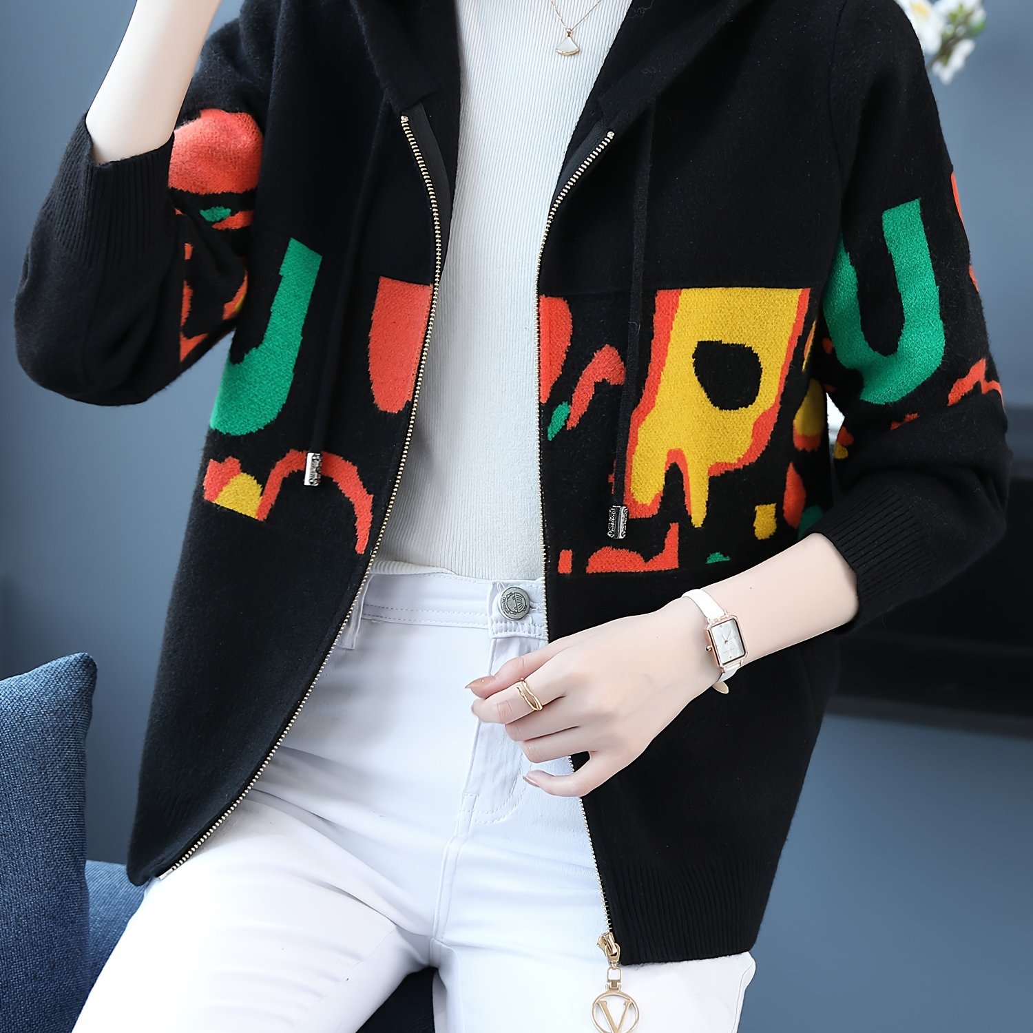 TEMU 알파벳 패턴이 있는 여성용 후드 집업 카디건, 아크릴 니트 원단, 긴팔, 일반 핏, 약간의 스트레치, 가을/겨울 컬렉션