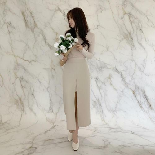 |KHK190B|여성 앞트임 H라인 슬림 일자 롱 스커트