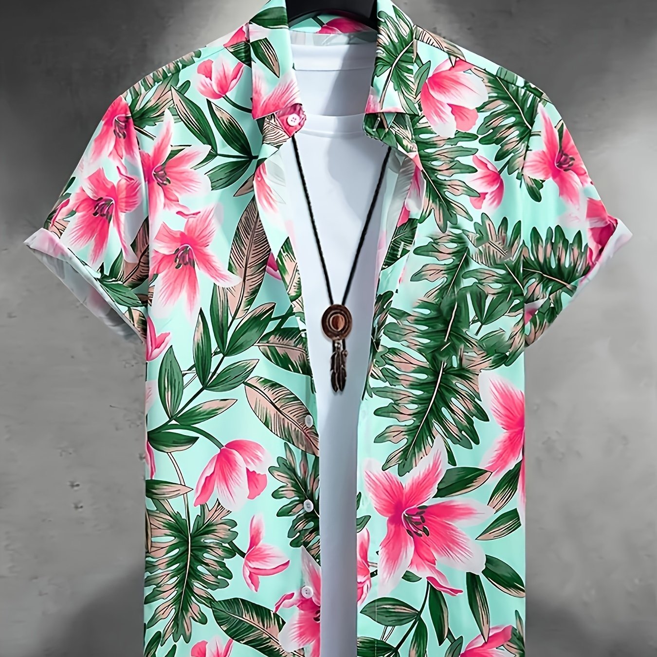 TEMU 여름 휴양복과 해변 휴가를 위한 시원하고 트렌디한 상의, 남성용 열대 꽃무늬 프린트 라펠 셔츠, 반팔과 버튼 다운 플래킷