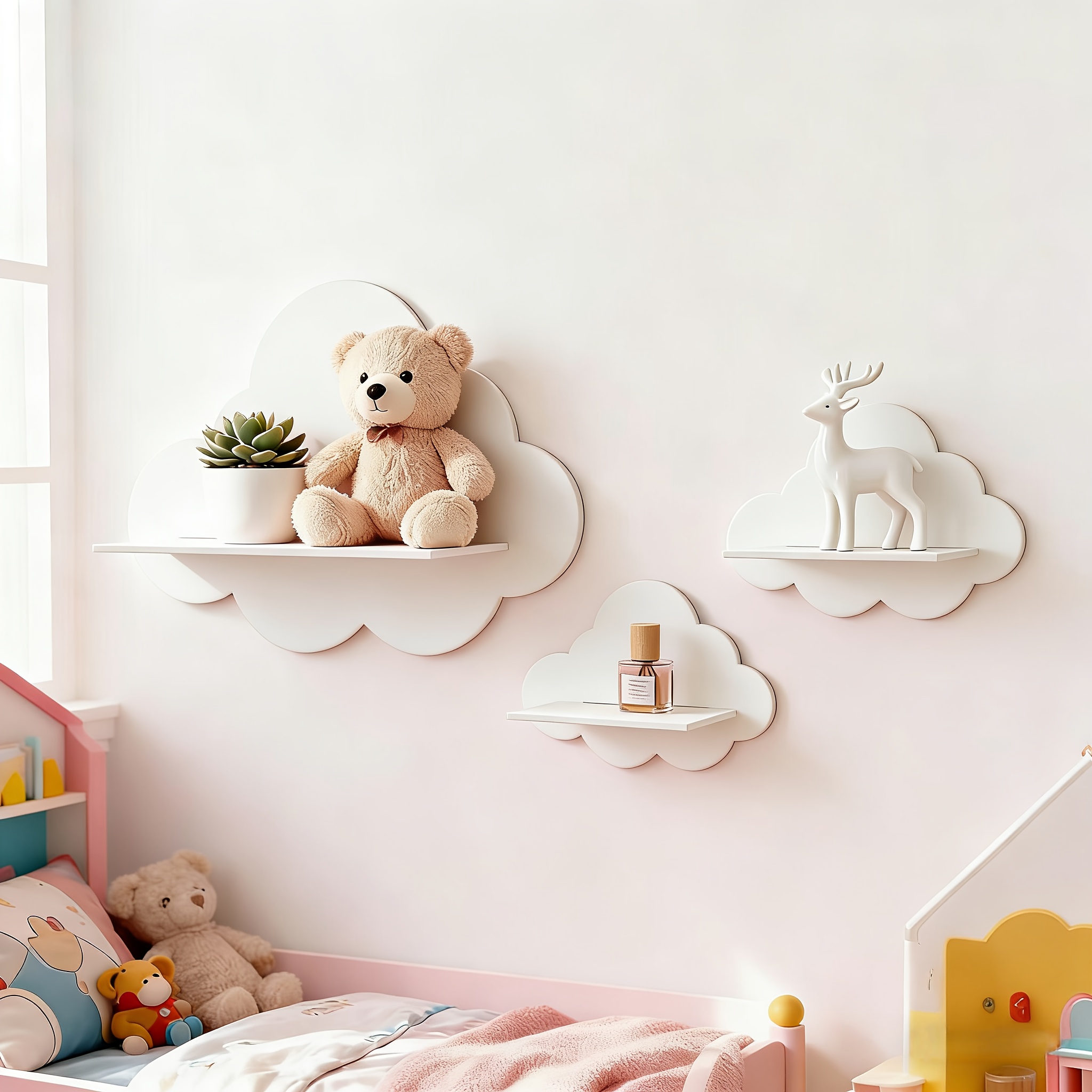 TEMU 침실 또는 거실의 장식적인 수납을 위한 흰 구름 모양의 벽 선반 3개 세트