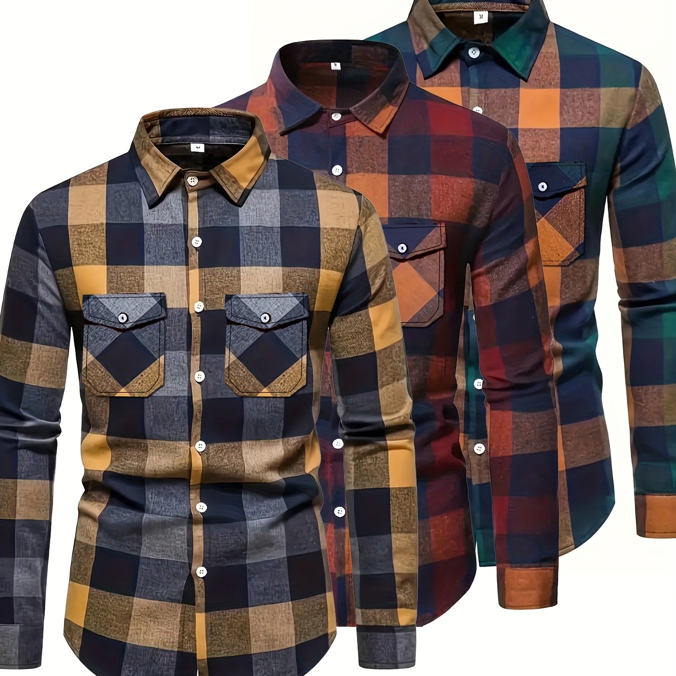 TEMU 남성용 체크무늬 라펠 셔츠 3세트, 긴팔 캐주얼 버튼업 셔츠, 야외용