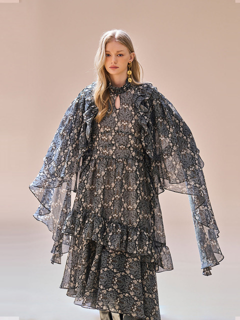 [까이에] [까이에] 키홀더 네크라인 언밸런스 페이즐리 프린트 실크 원피스