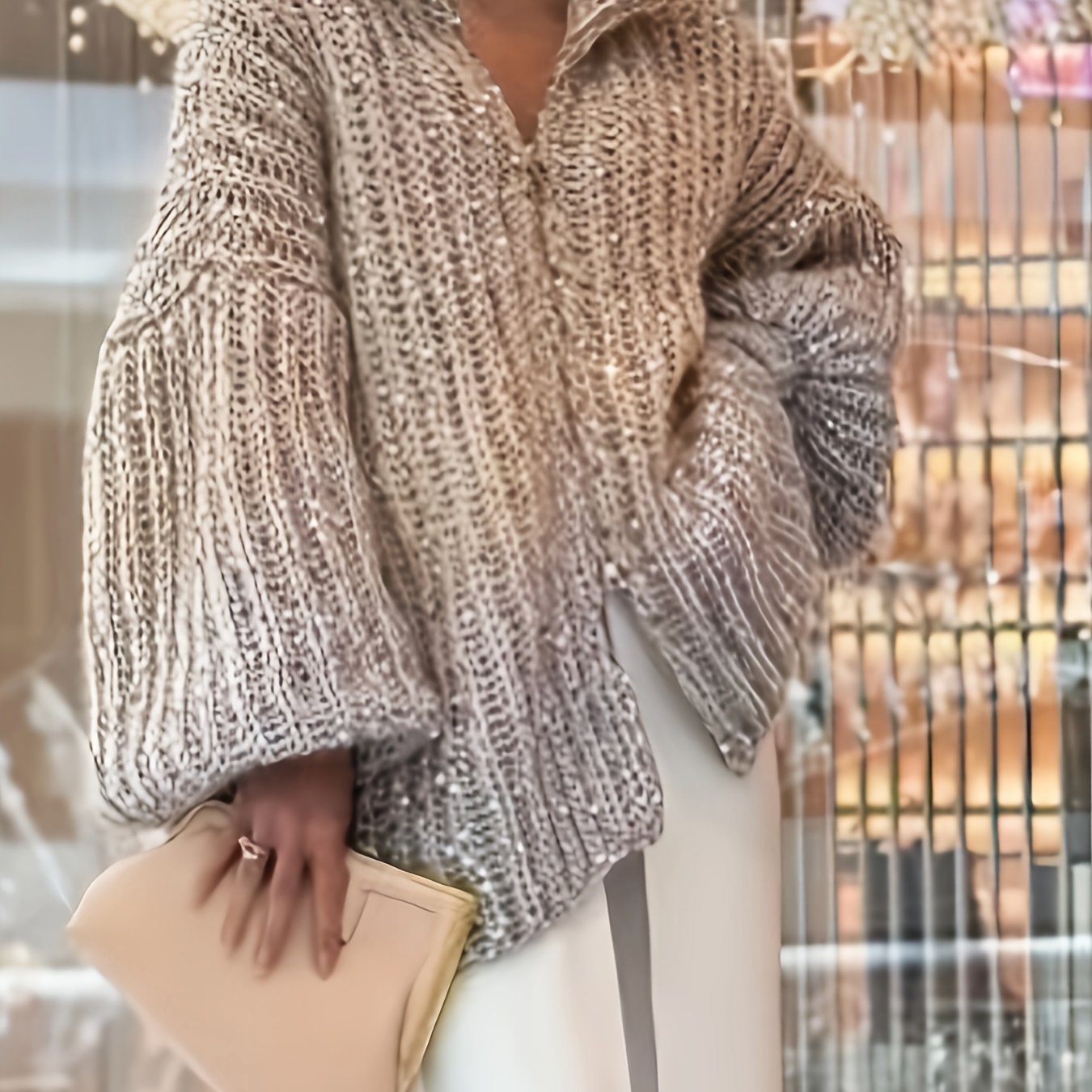 TEMU 새로운 가을/겨울 여성 패션 랜턴 소매 투피스 스웨터 코트, 단색, 하이넥, 루즈하고 편안한 스타일, 유럽 및 미국 스타일 시크, 작은 향기 스타일 가디건
