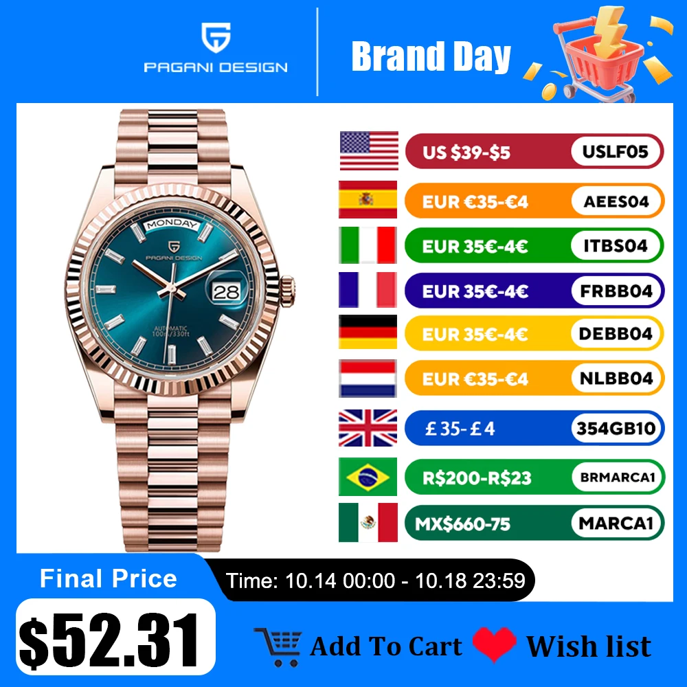 PAGANI DESIGN DD36 남성용 시계 로즈 골드 럭셔리 자동 시계 남성용 기계식 손목 시계 AR 사파이어 방수 시계 선물