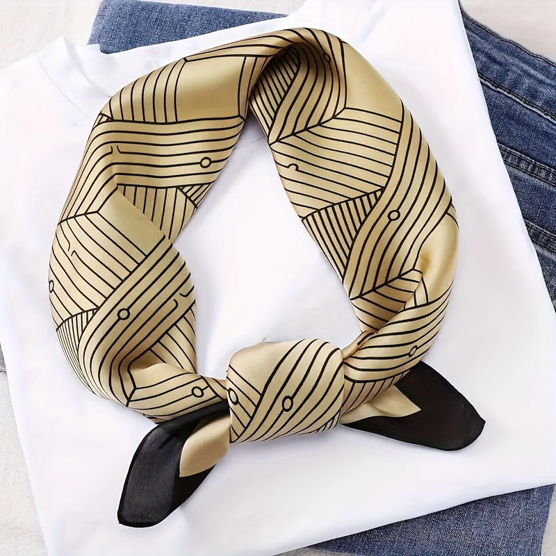 TEMU 여성용 우아한 기하학적 사각 스카프 - 100% 모란색 실크 소재, 가볍고 통기성 좋음, 화이트 및 브라운의 모던한 디자인, 스타일리시한 스타일의 목에 완벽하게 어울립니다. 블랙 베이스와 베이지/브라운 가 특징입니다.