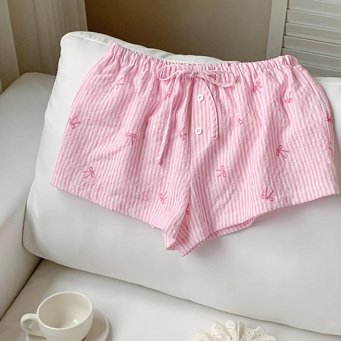 TEMU 여성용 Y2K 핑크 리본 & 반바지 - 귀여운 여름 반바지, 버튼 클로저, 논스트레치 캐주얼 비치웨어, 사계절 아웃핏 (세탁기 사용 가능) 파티, 피크닉, 데일리 스타일