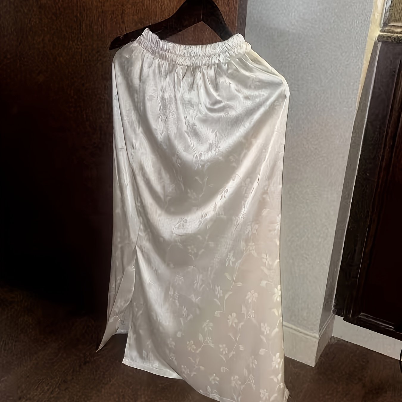 TEMU 심플한 플로럴 광택 새틴 반사 스트레이트핏 캐주얼 슬릿 스커트, 경량 롱 원웨이 워크 드레스