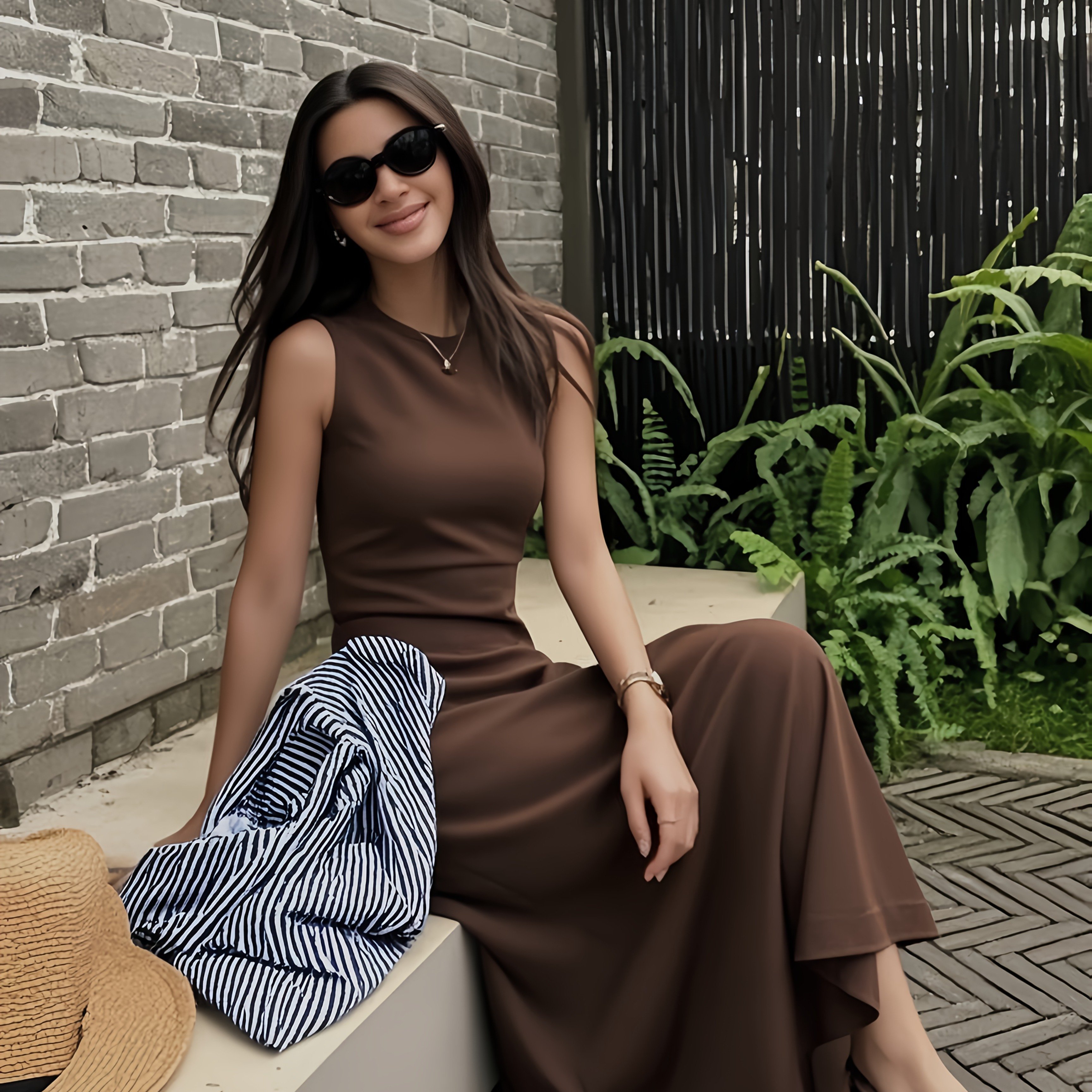 TEMU 여성 브라운 라운드넥 베스트 드레스, 여름 디자인, 핏 좋은 허리, 여행 및 휴가에 적합한 롱 드레스