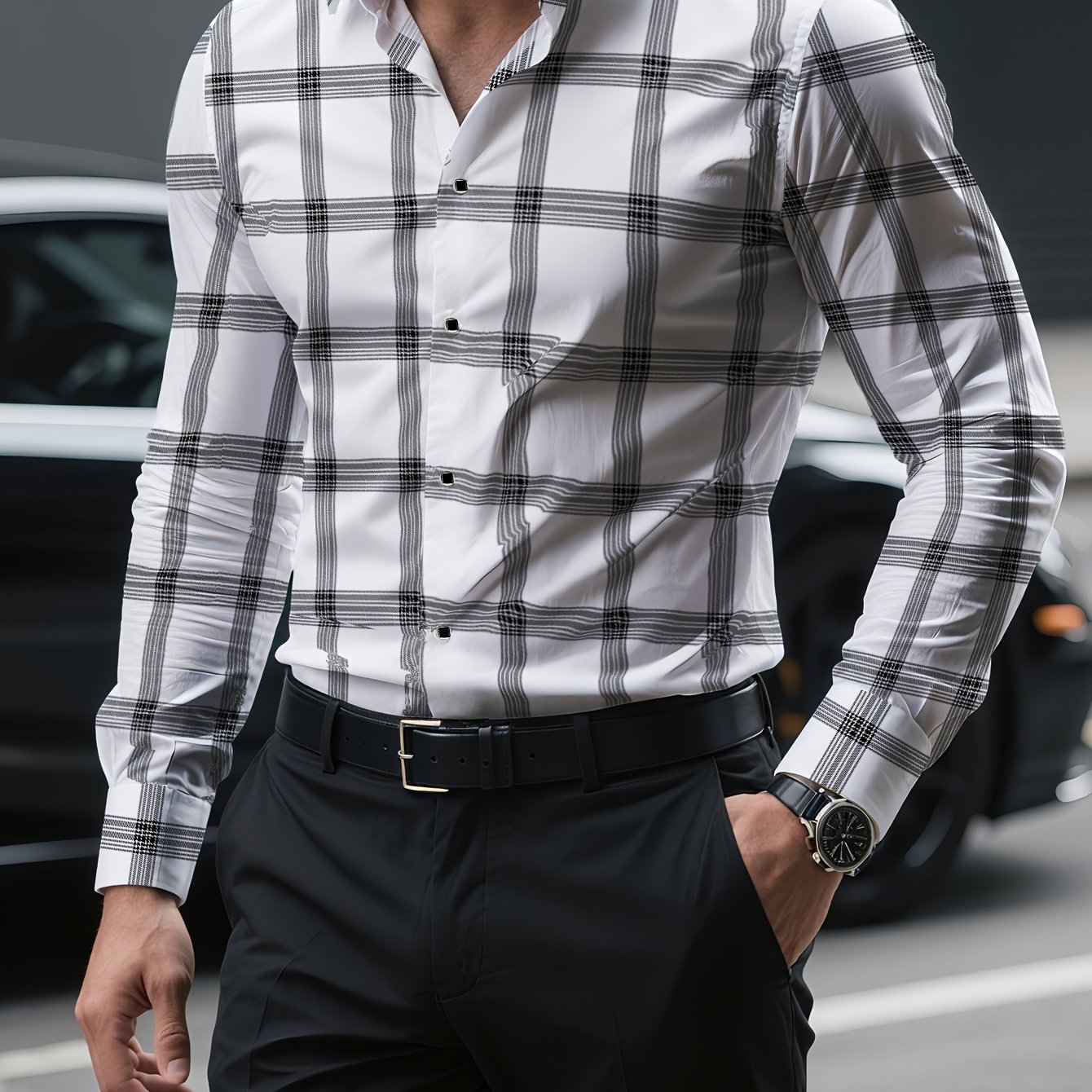 TEMU 남성 패션 드레스 셔츠 - 100% 폴리에스터, 비침 방지 원단, 봄/가을용, 체크무늬 정장 셔츠, 데일리 웨어, 내구성 있는 소재, 부드러운 질감, 클래식 칼라 디자인, 출근-비즈니스-파티 스트리트 스타일 - 고품질 스티칭, 트렌디한 탑