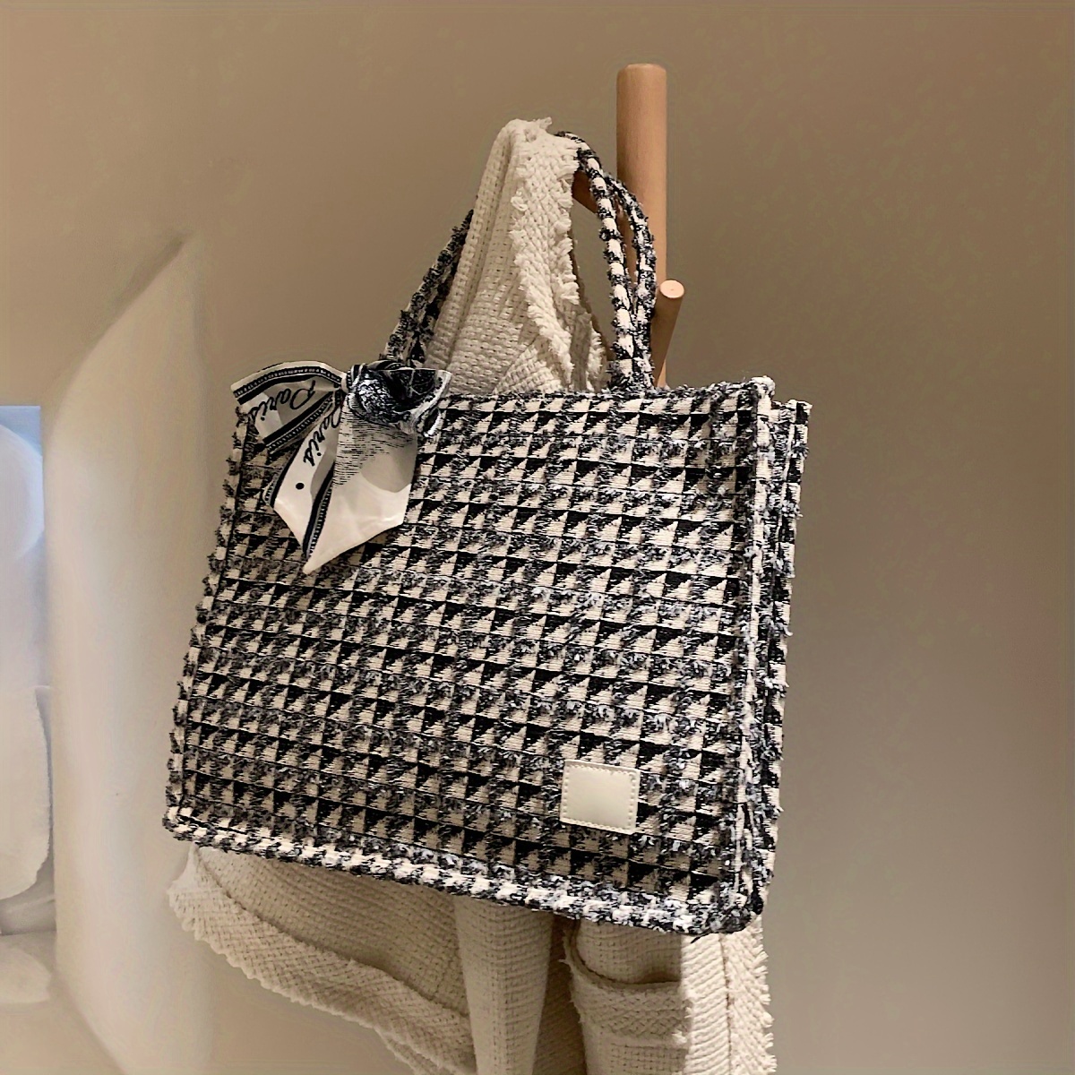 TEMU 빈티지 감성의 여성용 토트백 - 스카프 액센트, 체크 패턴, 지퍼 클로저로 넉넉하고 스타일리시한 데일리 커뮤트 가방