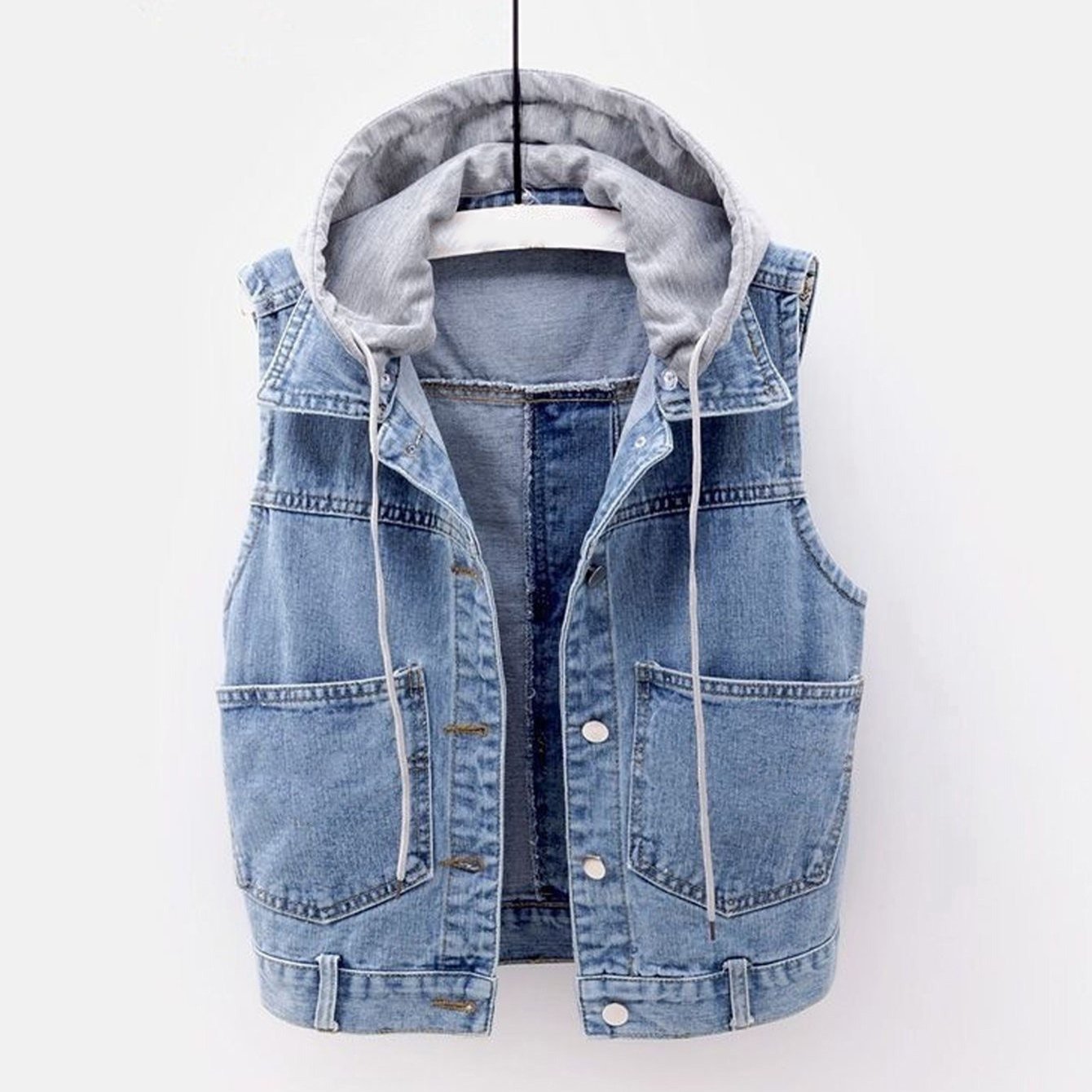 TEMU 여성 데님 베스트 캐주얼 민소매 조끼 (후드 탈부착 가능) - 캐주얼한 스타일, 솔리드 컬러, 앞 포켓, 다양하게 착용 가능한 베스트로 다양하게 매치할 수 있으며 다양한 룩에 매치하여 아름다운 몸매를 연출할 수 있는 포인트 효과