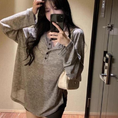 여성 골지 버튼 니트 긴팔티 1P 루즈핏 베이직 티셔츠 WFL0OPI